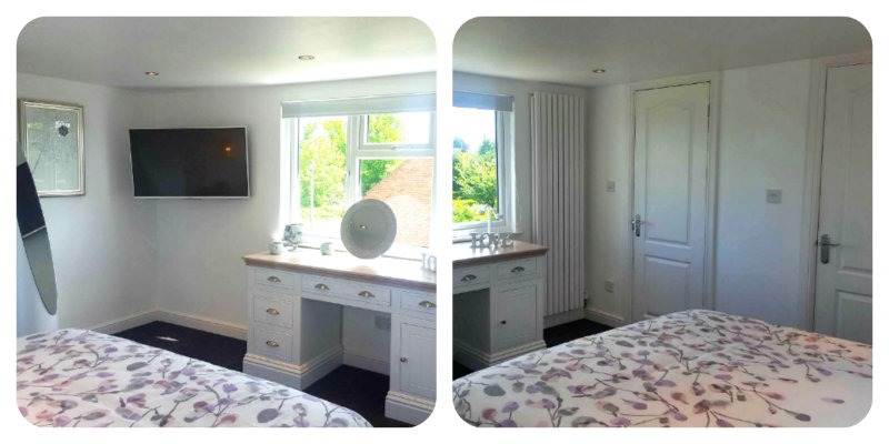 This stylish loft conversion bedroom has great storage areas, with cupboards in the eves of the loft and built in wardrobes. The room features a space saving long modern radiator and a spacious dressing area ideal for any woman!