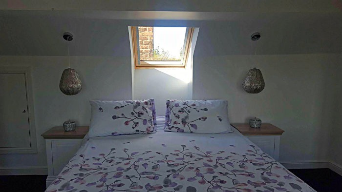 Velux roof light windows are great features within a loft space, flooding the room with lots of natural light. The roof light in the picture below is centralised in the bedroom situated behind the bed with stunning light pendants either side.